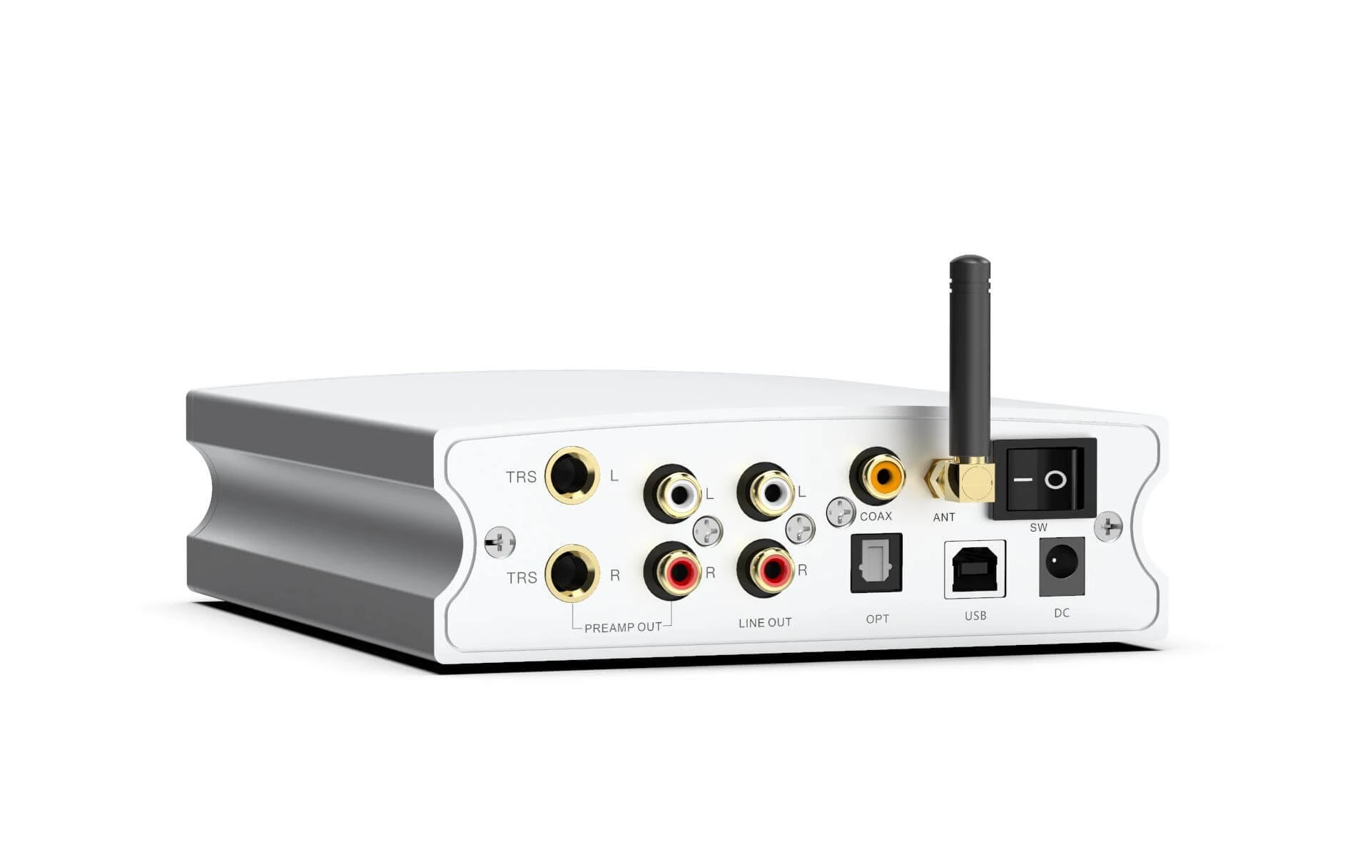 – Entrées: Port USB-B, entrée optique, entrée coaxiale, antenne Bluetooth // Sorties: Sortie ligne RCA (RCA L/R), sortie préamplifiée TRS symétrique (TRS L/R), sortie préamplifiée RCA (RCA L/R)